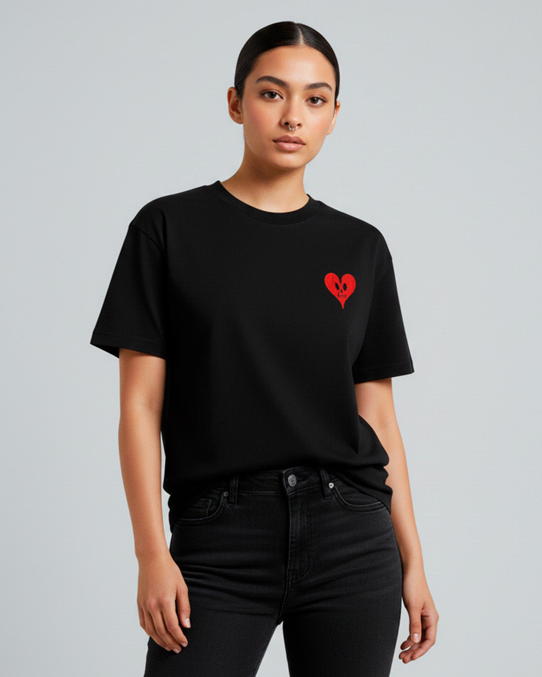 Una flor que recuerda y duele. Esta playera negra de corte regular presenta al frente, del lado derecho del pecho, una pequeña hoja de anturio rojo con forma de calavera, símbolo de belleza y memoria.