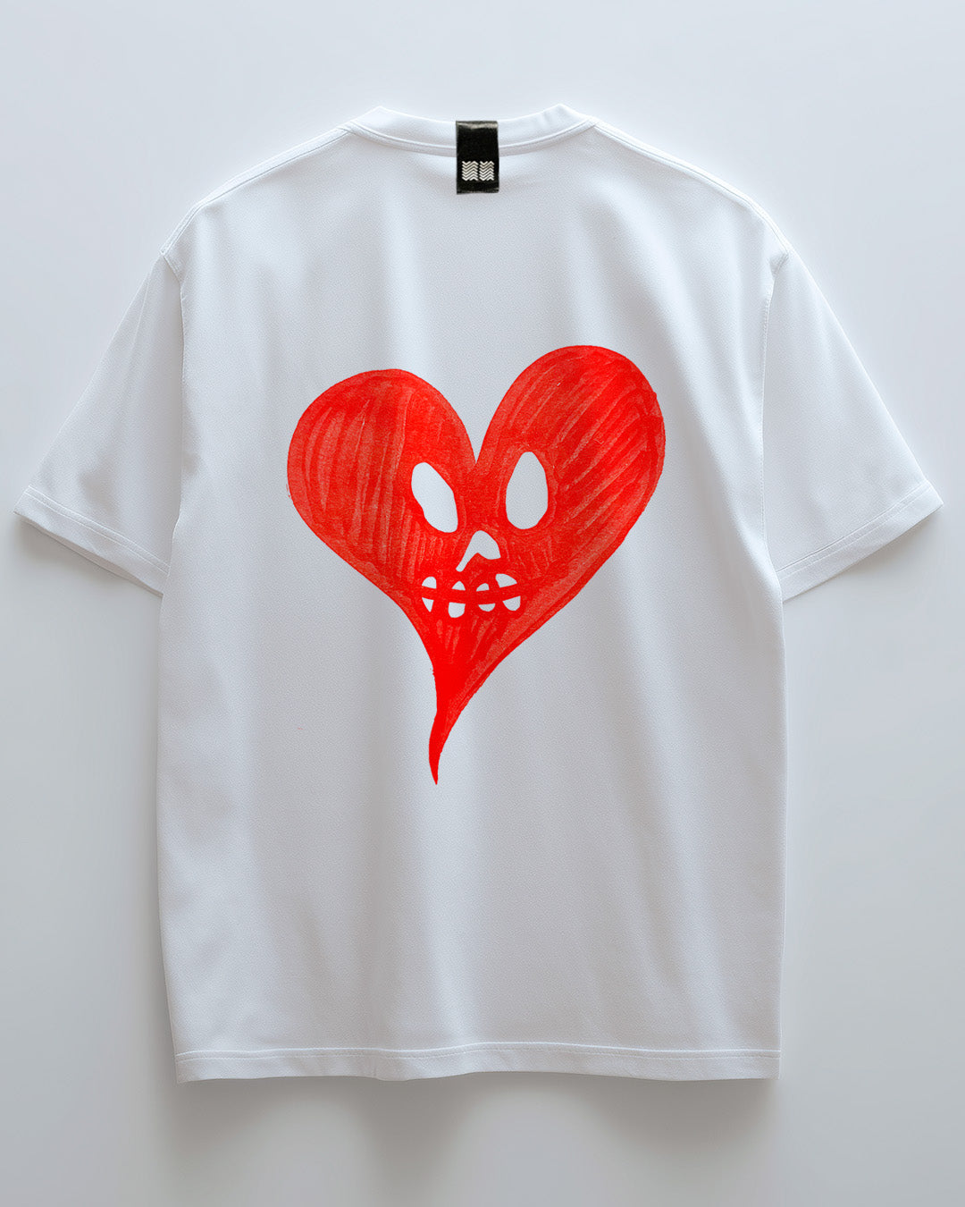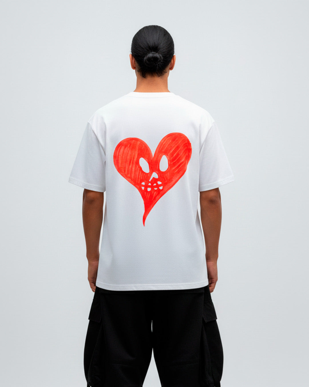 Una flor, una calaverita y un recuerdo eterno. Esta versión en blanco de la Hoja Cráneo mantiene el estampado de la hoja de anturio roja ilustrada a mano con forma de calaverita, ahora sobre una base clara que resalta cada línea. Al frente, el logotipo de Life Et Muerte: “Life et” en blanco, “muerte” en rojo.