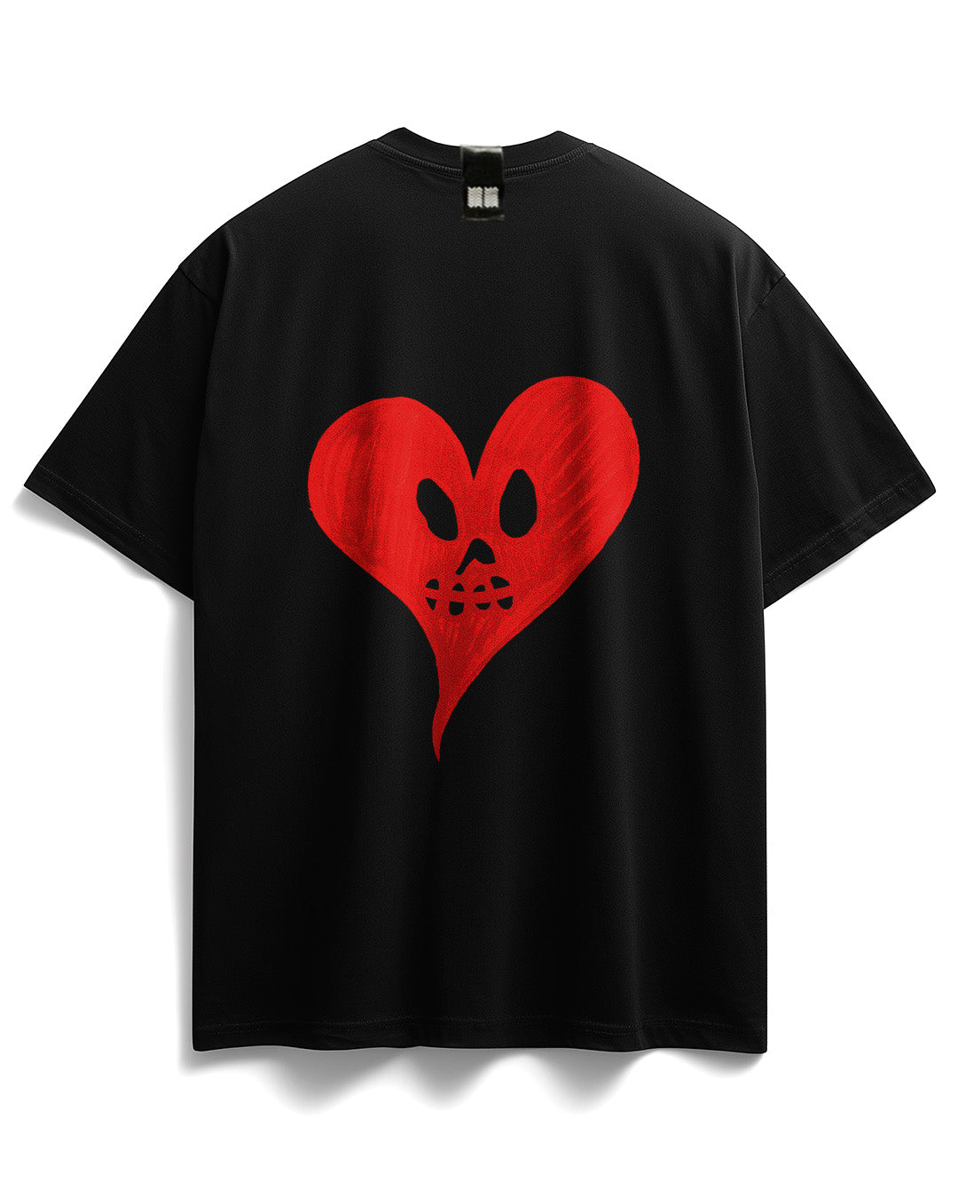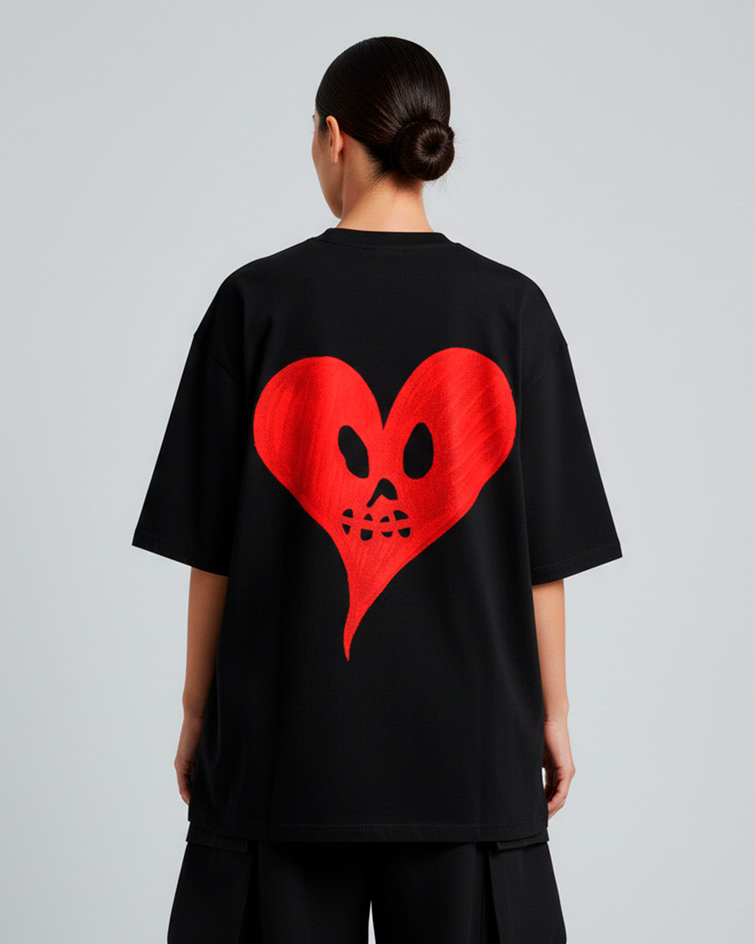 Una hoja con alma. Esta playera oversize negra tiene en la espalda el dibujo de una hoja de anturio roja, ilustrada a mano con detalles que simulan una calaverita: dientes, ojos y nariz sutilmente integrados. Al frente, el logotipo de Life Et Muerte, con “Life et” en negro y “muerte” en rojo.