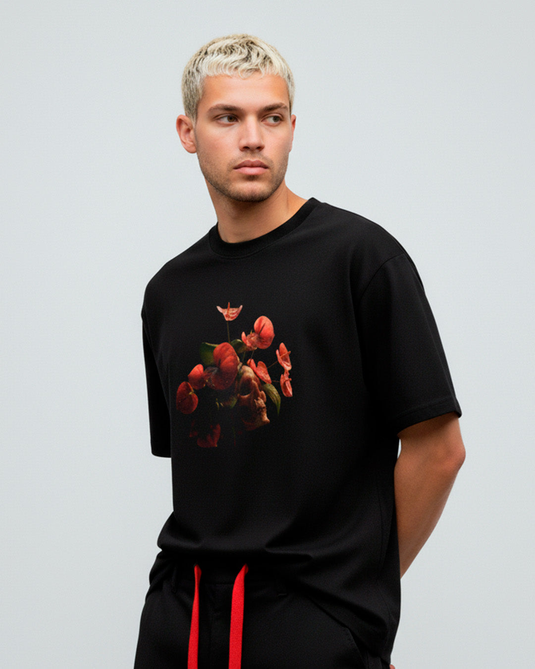 La vida que florece desde la muerte. Esta playera negra oversize presenta al centro el estampado de un cráneo del que emergen anturios rojos, esas flores brillantes que parecen hechas de plástico, pero laten como un corazón.