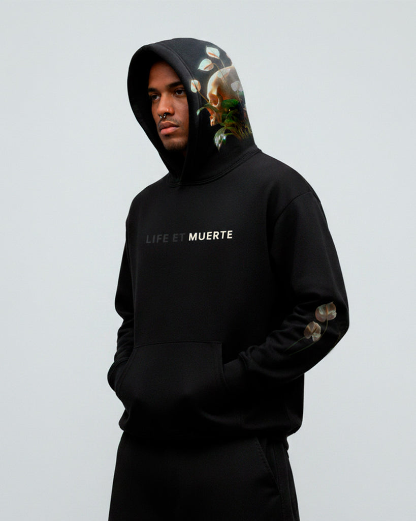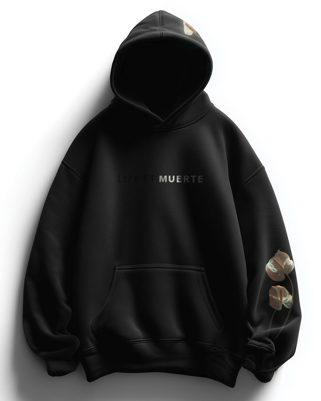 Oscura y serena como una despedida. Esta hoodie oversize negra presenta en la capucha el estampado de un cráneo rodeado de flores blancas Cuna de Moisés. En la manga, dos flores más acompañan el diseño, mientras que al frente el logotipo de Life et Muerte aparece dividido: life et en negro y muerte en blanco.